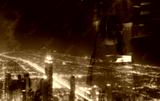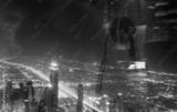 A reflection of a little girl in the red cloak against the night urban background. Superhero concept