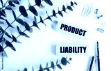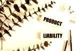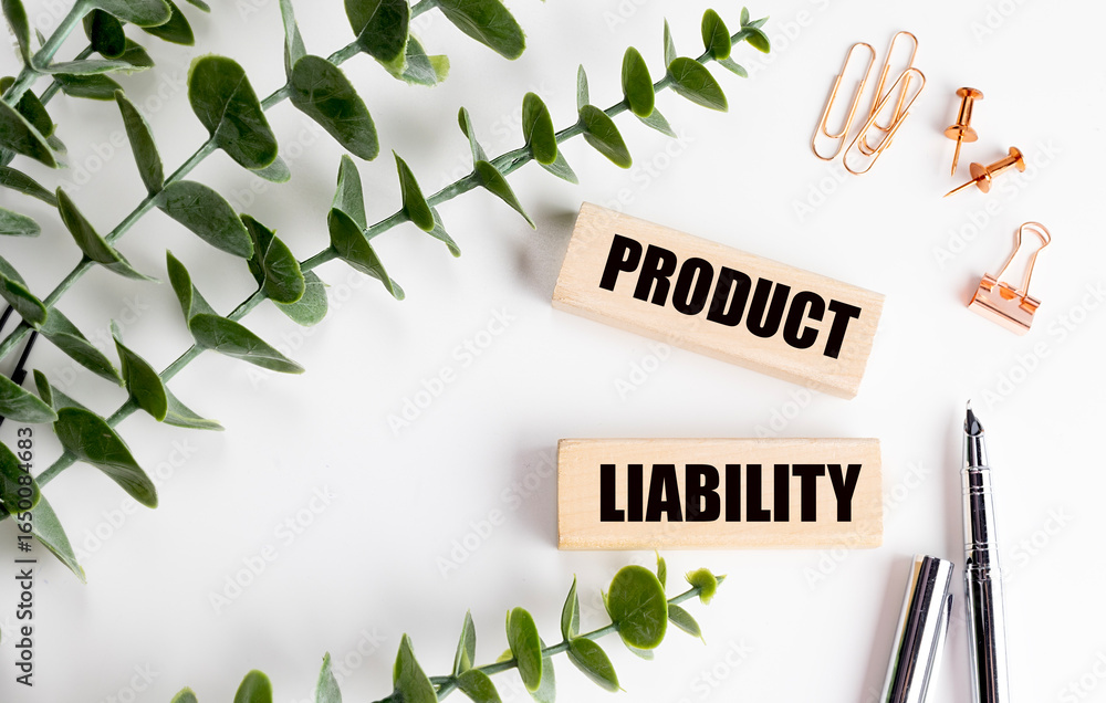 Product liability text on wooden blocks with green leaves, pens and office supplies on white background