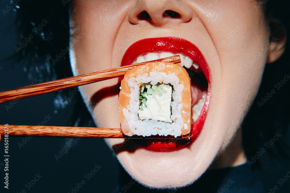Close-up of a woman excitedly holding sushi with chopsticks, showcasing vibrant makeup, contrasting colors, and a playful expression.