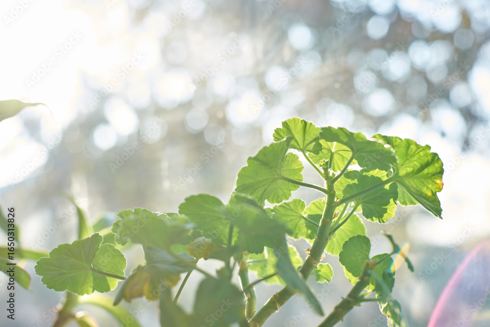Sunlit green leaves with soft bokeh effect and natural background in a bright setting.