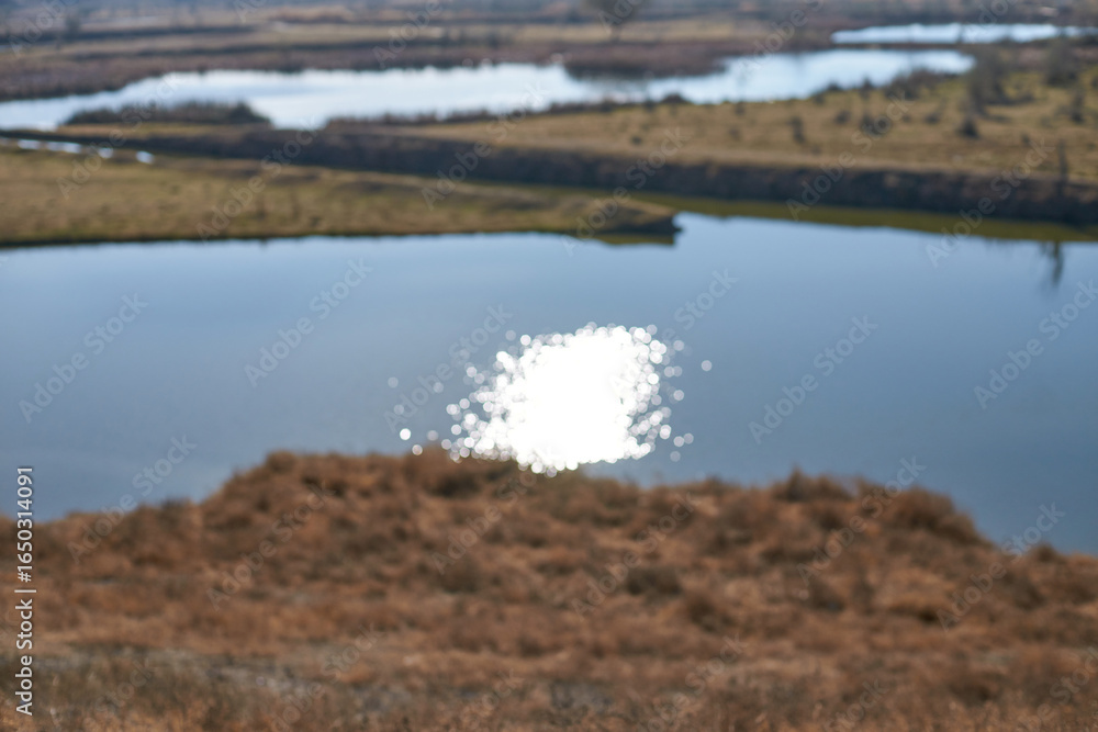 Scenic view of river with sunlight reflection surrounded by dry grass landscape.