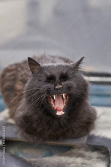 Fierce black cat yawning, displaying sharp teeth in a close-up feline portrait.