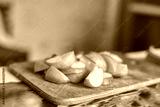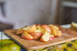 Freshly sliced red apples on wooden cutting board in a kitchen setting.