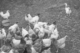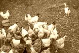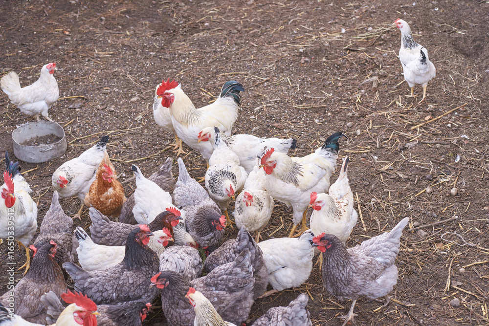 Flock of various chicken breeds in farmyard pecking at ground for food.