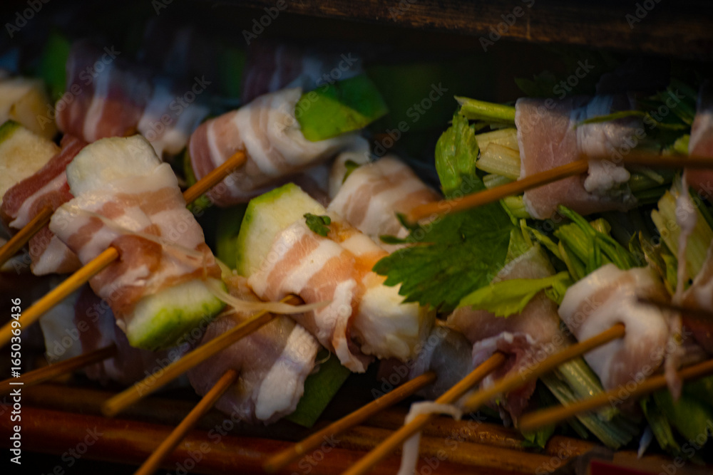 a variety of skewer ingredients neatly arranged on a rack at a Taiwanese night market BBQ stall