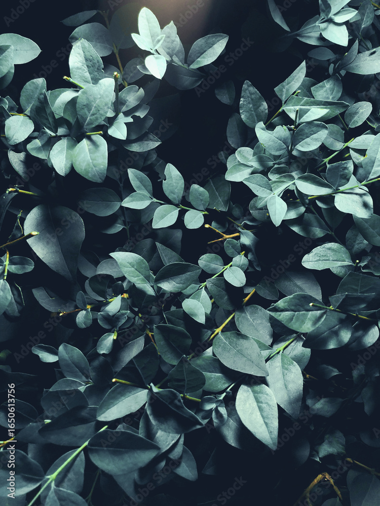 Close-up of lush green leaves with a dark background, showcasing natural texture and vibrant foliage.