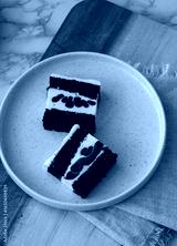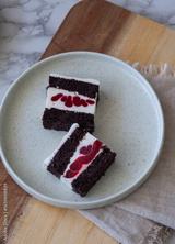 top view of elegant dessert plate with cholate sponge, souffle and raspberry layer cake slice