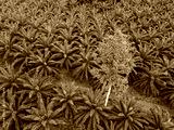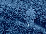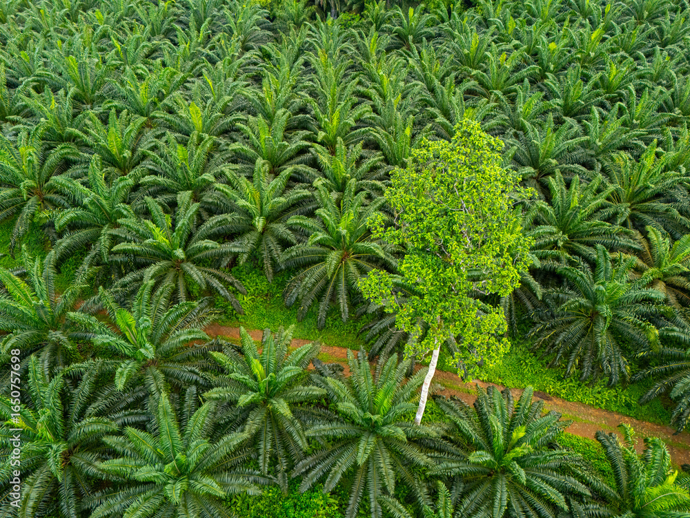 Aerial view of a dense palm oil plantation in São Tomé with a single contrasting green tree standing out.