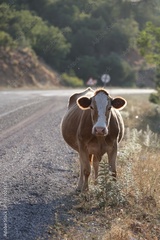 A cow is grazing in a field. A cow in a field near the road. A red and white cow. High quality photo