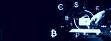 Digital wallet icon and cryptocurrency symbols over tablet with user hand on futuristic blue background, representing online finance and fintech concept.
