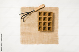 Gardening tools top view on white wooden planks background with copy space around products. Border with place for text. Gardening or planting concept seen from above. Working in a clean indoor garden.