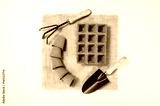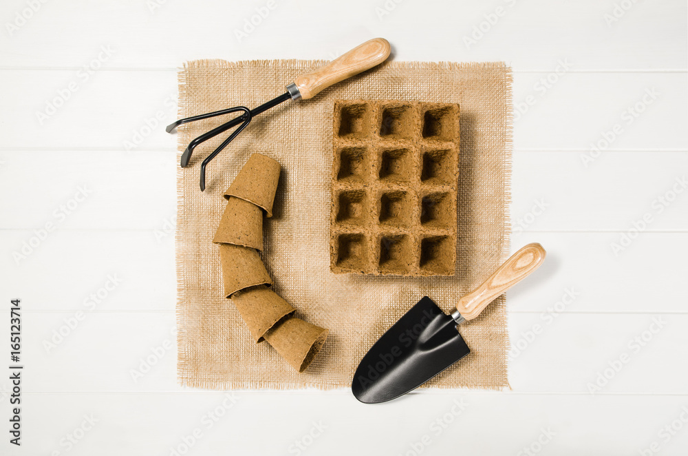 Gardening tools top view on white wooden planks background with copy space around products. Border with place for text. Gardening or planting concept seen from above. Working in a clean indoor garden.