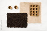 Gardening tools top view on white wooden planks background with copy space around products. Border with place for text. Gardening or planting concept seen from above. Working in a clean indoor garden.