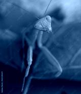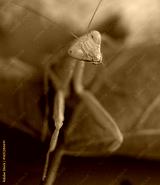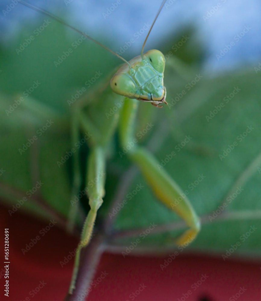 This close-up image features a vibrant green praying mantis resting on a leaf, showcasing its intricate features and textures, perfect for nature and wildlife themes.