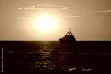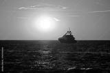 Luxury yacht on open sea at golden sunset