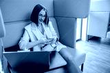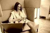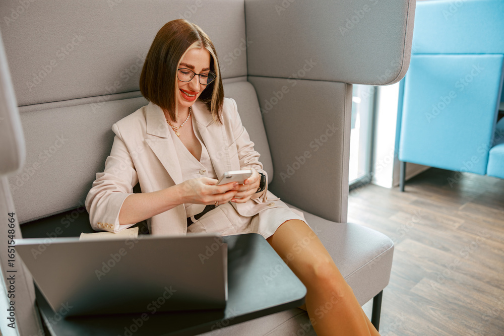 A young woman is happily engaged with her smartphone in a contemporary workspace, enjoying her tech and surroundings