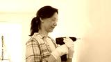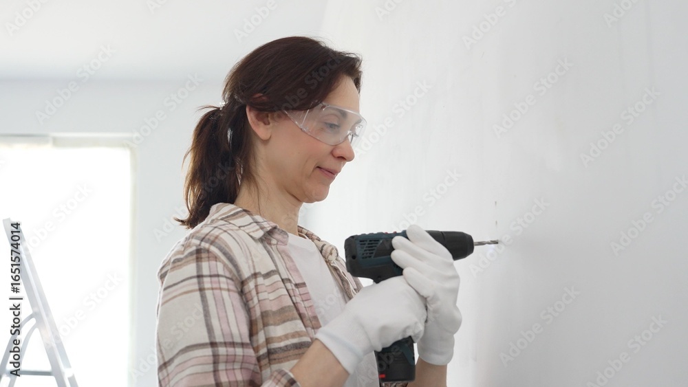 Woman wearing protective gear drilling hole in white wall during home improvement project, focused on precise home renovation work