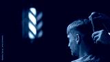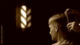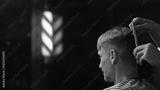 Professional barber cutting hair of male client in barbershop, using scissors and comb, with barber pole in background, creating stylish and modern haircut