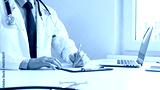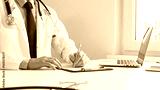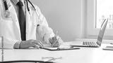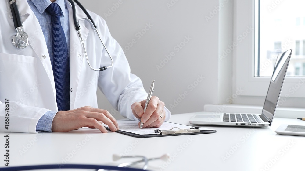 Male doctor writing a prescription and filling out medical records on a clipboard in an office setting, showcasing the essential aspects of healthcare and patient care. Medicine and health care