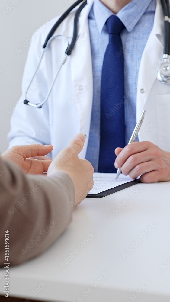 Unknown male doctor taking notes while listening to a female patient explaining her symptoms during a medical consultation in the clinic office. Medicine concept