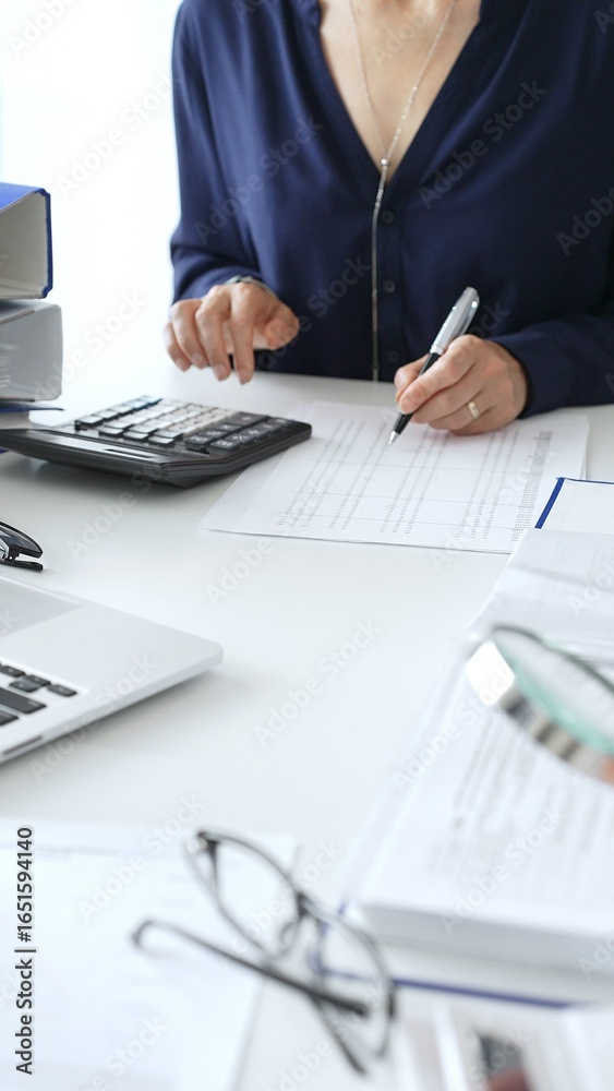 Female financial analysts examining documents, using magnifying glass and calculator while studying corporate data at workplace. Audit and taxes