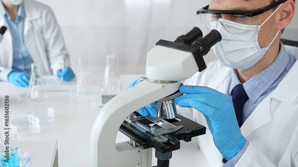 Masked scientist analyzing sample under microscope, colleague researching nearby in sterile medical laboratory setting. Medicine, healthcare and science concept