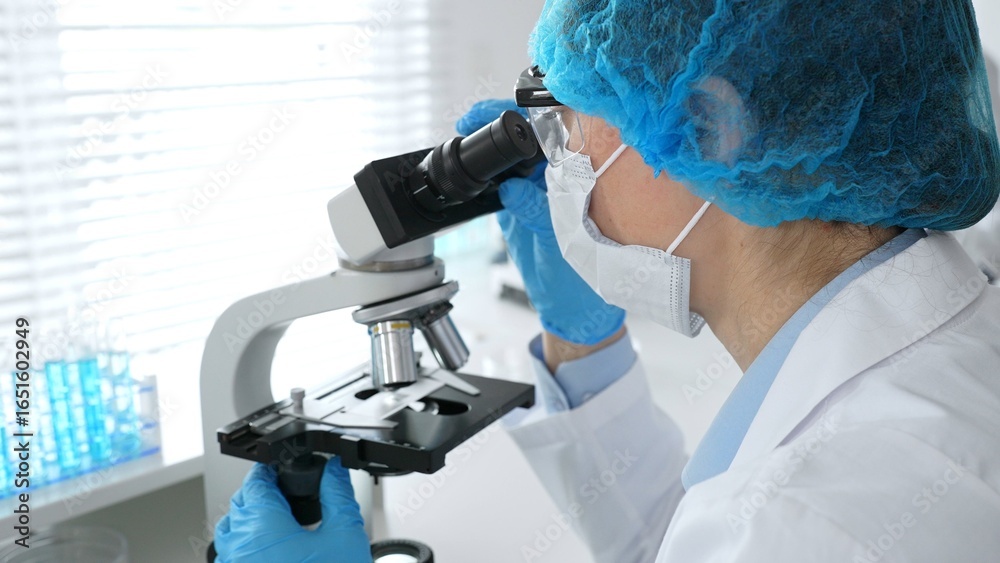 Female scientist wearing a mask and blue safety gear, using a microscope for research while a male colleague works in the background. Medicine, healthcare and science concept