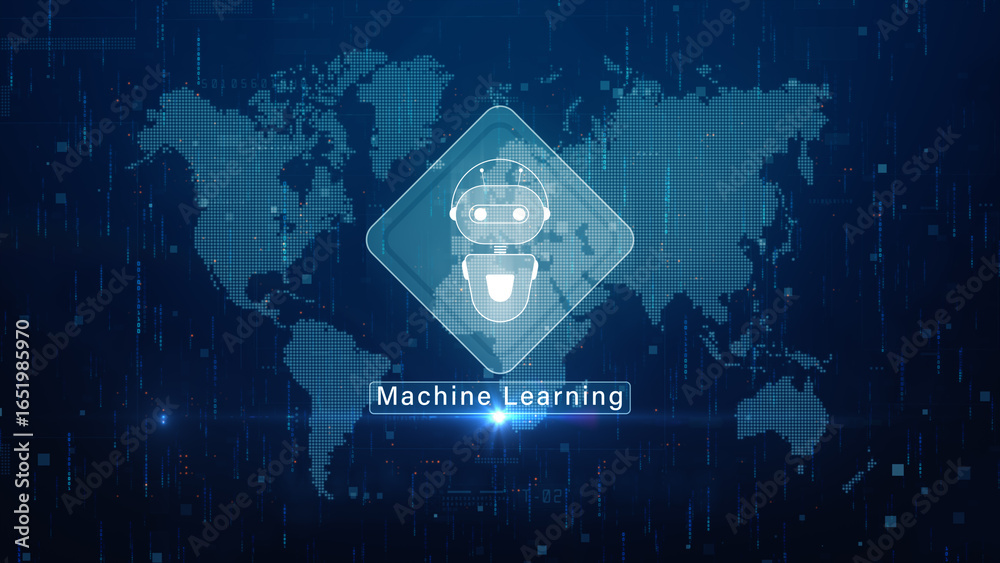 Robot icon and machine learning concept on digital world map background, representing artificial intelligence and big data analytics. Technology digital abstract background. 3d Rendering