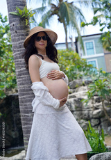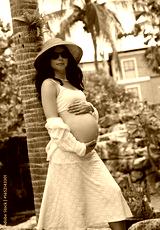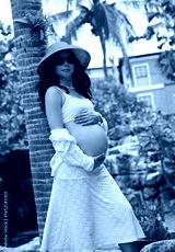 A pregnant woman is gracefully standing in front of a beautiful waterfall rock