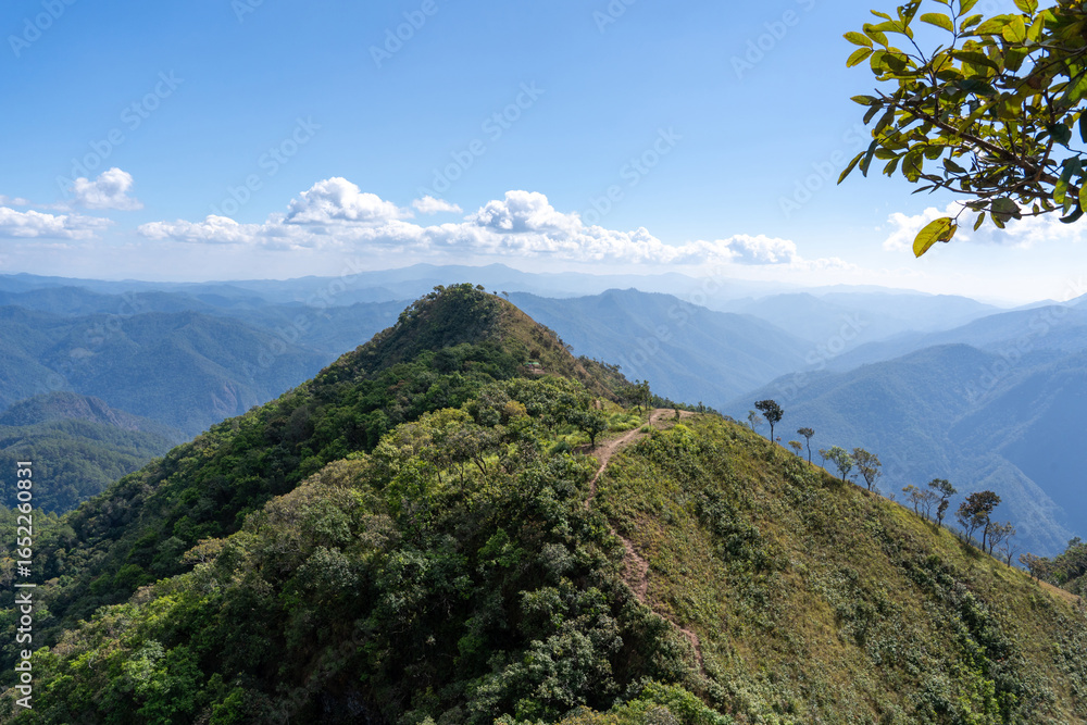 A breathtaking scenic mountain view in Mae Hong Son, northern Thailand, captures the serene beauty of the landscape. The image showcases rolling hills, lush green and clear sky, bathed in soft,natural