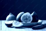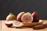 Fresh half and sliced fig on wooden plate and cutting wooden board with black background, Autumn fruit