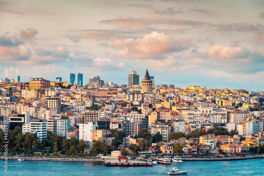 Beautiful view of Galata tower (Galata Kulesi) with Beyoglu district through Bosphorus Strait while viewed from Suleymaniye Mosque lookout at sunset time, Istanbul, Turkey