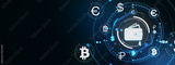 Digital wallet icon surrounded by cryptocurrency and global currency symbols on futuristic glowing network background for finance and blockchain concept. 3D Rendering