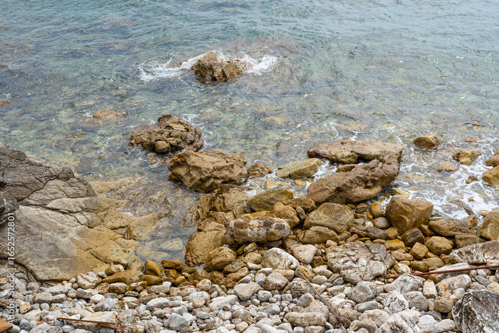 Rocky coastline with clear blue sea and distant green cliffs in Montenegro