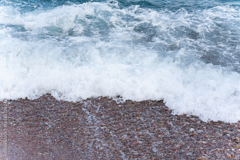 Foamy Adriatic waves wash over a colorful pebble beach in Montenegro. High quality photo