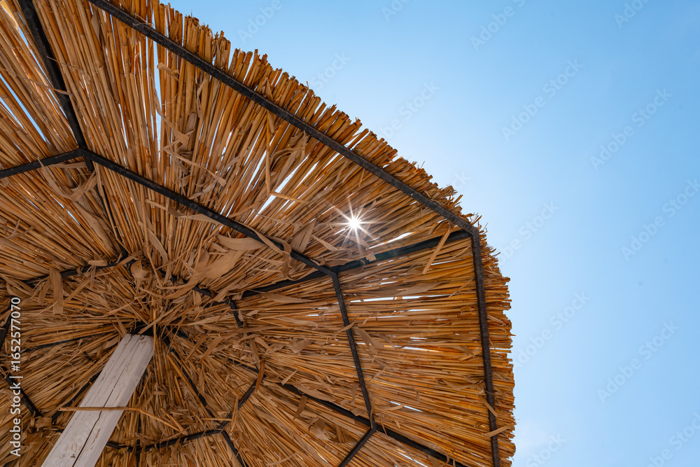 Straw umbrella under the sun on the Adriatic beach of Montenegro
