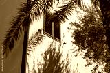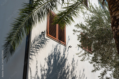 Shadows of palm and olive trees on a white wall with wooden shutters