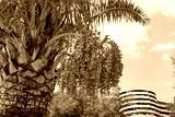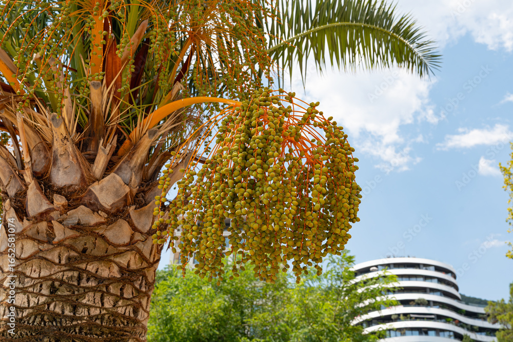 Close-up of green Date palm fruits hanging against blue sky in Budva, Montenegro