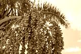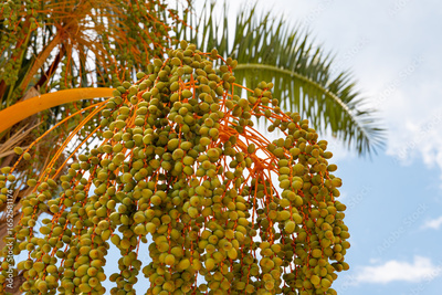 Close-up of green Date palm fruits hanging against blue sky in Budva, Montenegro
