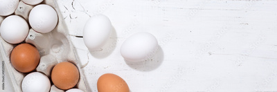 Eier Schachtel Eierschachtel Ei Holzbrett Banner Essen Textfreiraum von oben
