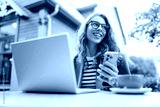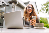 Stylish woman in glasses with laptop and phone at table on terrace in cafe. Young female freelancer working on laptop, with phone in hands on a sunny day. Freelancing, weekend concept.