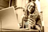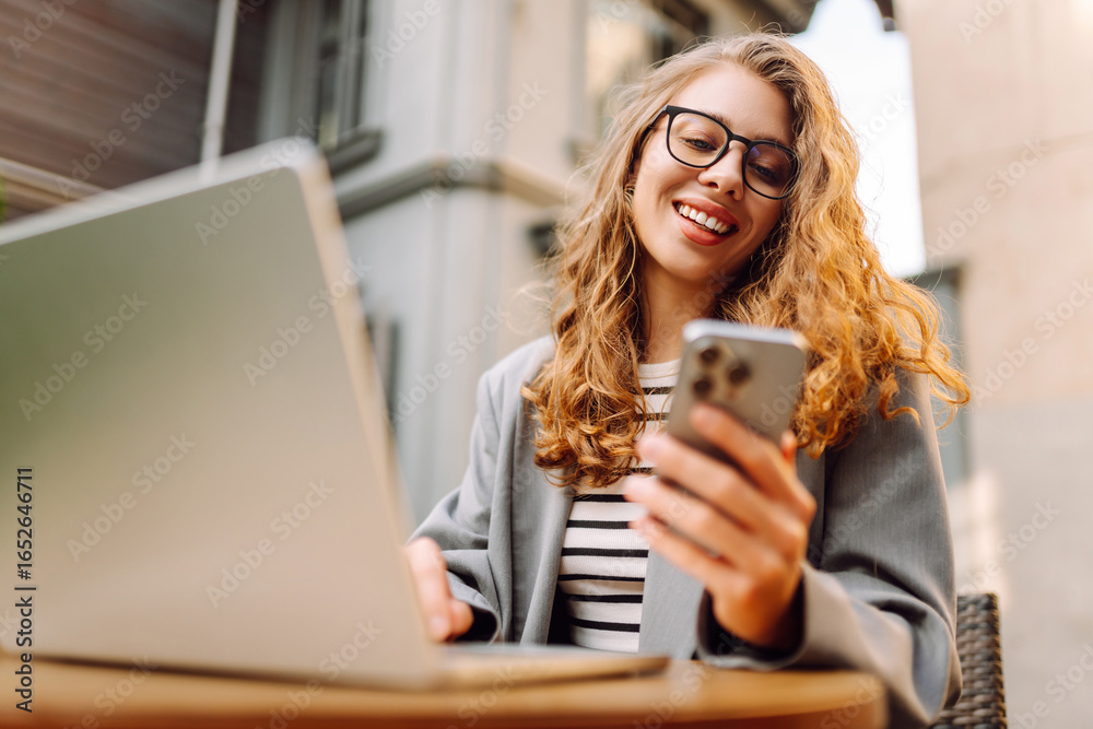 Stylish woman in glasses with laptop and phone at table on terrace in cafe. Young female freelancer working on laptop, with phone in hands on a sunny day. Freelancing, weekend concept.