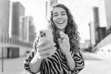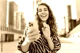 Curly woman with phone posing in sunset rays against metropolis background. Young tourist with smartphone blogging or texting while walking on city street. Technology and blogging concept.