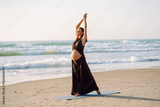 Pregnant woman with yoga mat practicing relaxation exercises on sandy beach. Beautiful expectant mother exercising and meditating at sunrise enjoying sea view. Health, relaxation concept.