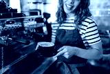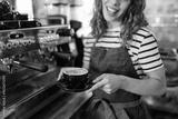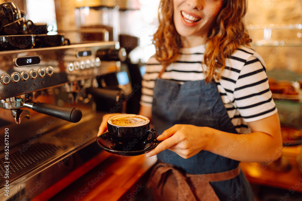 Close-up of female barista's hands holding a cup of hot coffee at bar counter of coffee shop. Young woman inapron prepared a fragrant coffee drink in a cozy space. Small business, beverages concept.