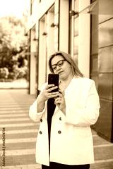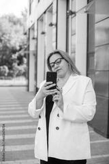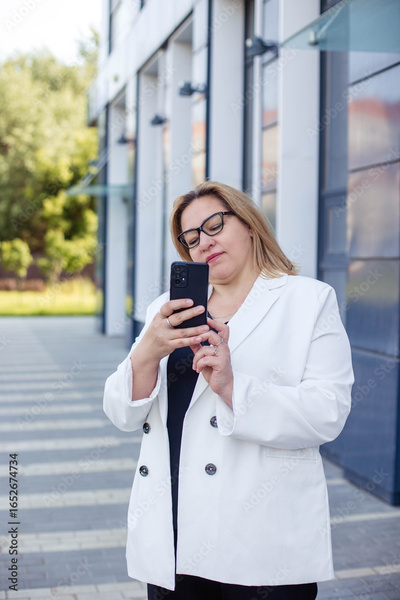 Plus size woman taking photos of smartphone near office, vertical photo