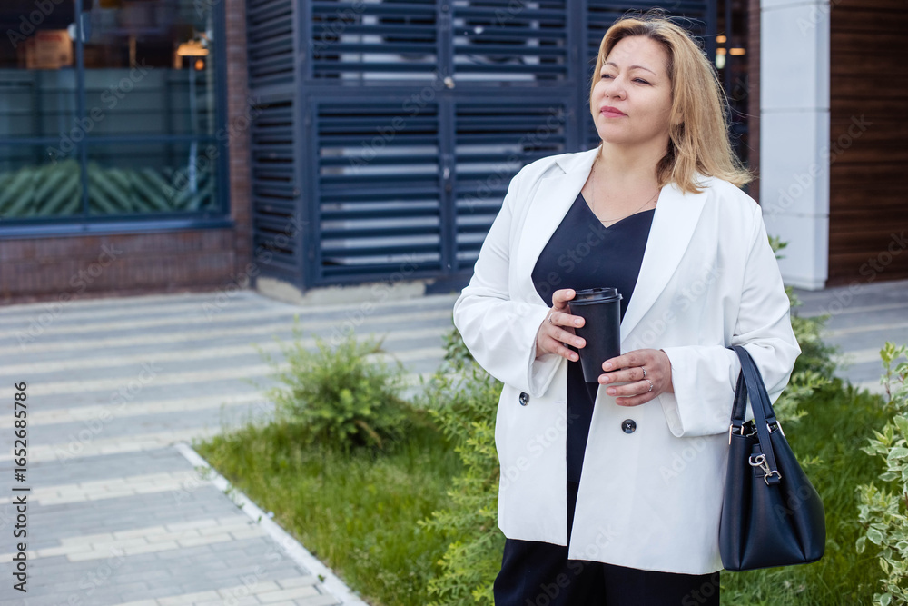 Close-up portrait of an attractive plus size woman with a cup of coffee in her hands, copy space