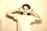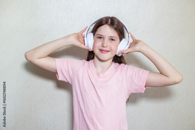 Close-up portrait of teenage girl in pink t-shirt, standing on gray background in headphones, holding them with hands, smiling and looking at camera