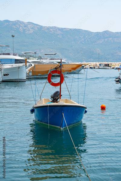 Traditional fishing boat anchored in Adriatic waters of Budva with scenic backdrop