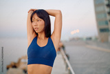 Asian woman wearing blue sportswear stretching arms on a seafront promenade during a workout session